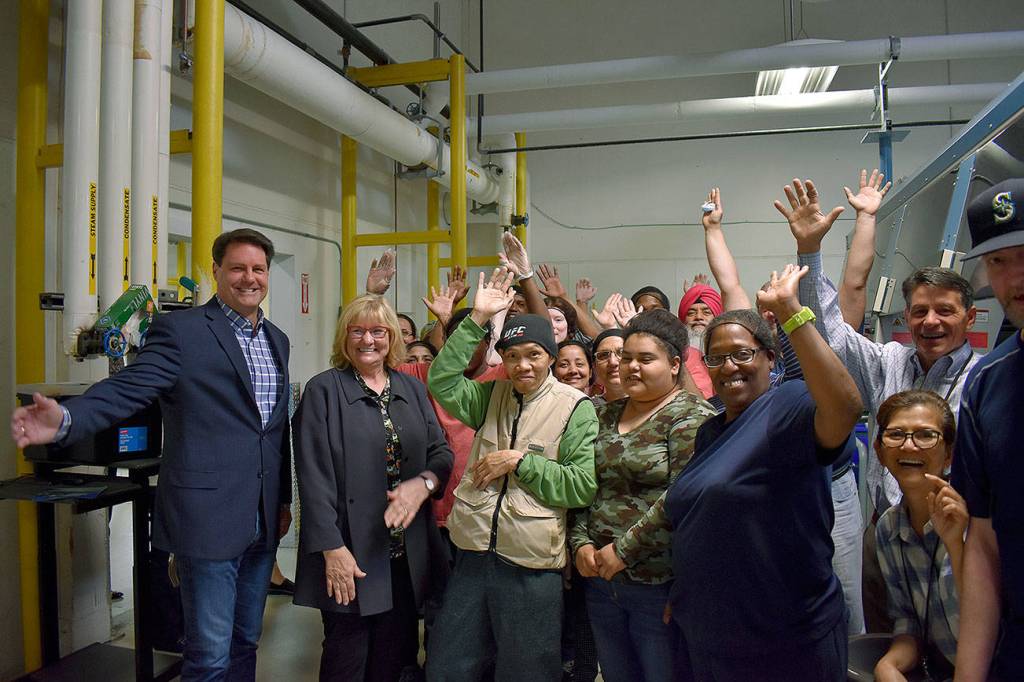 First Lady of Washington Trudi Inslee, second from left, joins Northwest Center President & CEO Gene Boes, far left, along with employees of Northwest Center’s Puget Sound Laundry Services (PSLS). Inslee toured the Kent facility and spent some time with workers Monday morning.