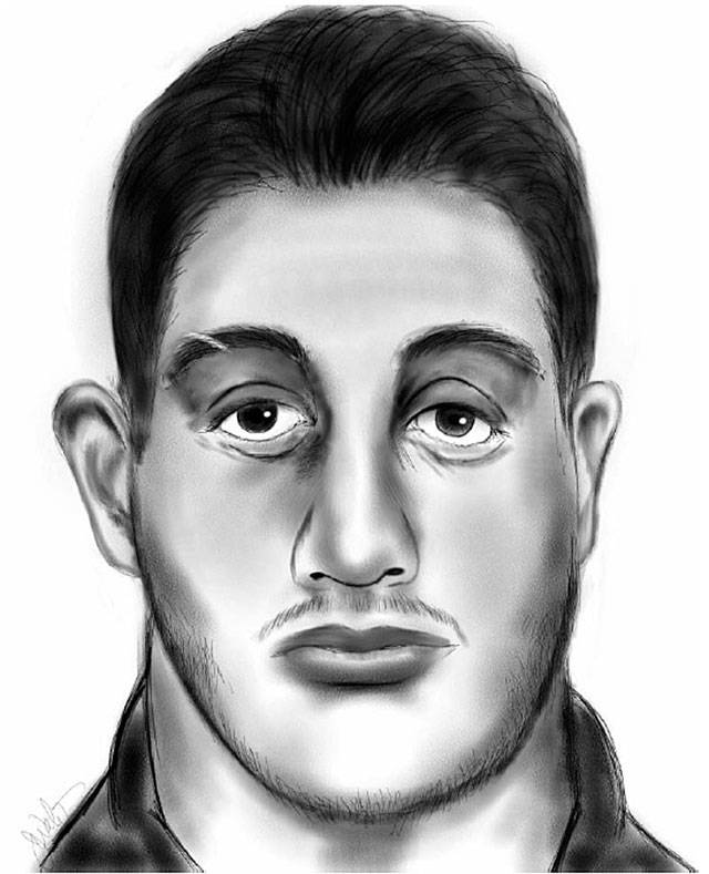 The suspect was described as having brown skin, possibly Hispanic or East Indian. He was 30 to 40 years old with an average height and build. He had dark hair that was short but wavy on top and his face was unshaven. He had a scar or mark on his right eyebrow and a green colored tattoo on his left clavicle/neck area. His teeth are crooked and stained like a smoker’s teeth. He was wearing a navy blue hoodie and long, black sweatpants that covered his feet.