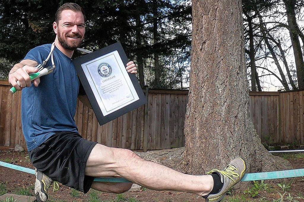 A year ago, Gielski shattered the record for “most consecutive skips over a rope on a slack line,” nearly doubling the previous mark of 15. What began as a training exercise to improve balance became an idea for a Guinness World Record. Gielski would steady himself on a thin nylon strap ratcheted between trees, later adding complexity by skipping rope while suspended.