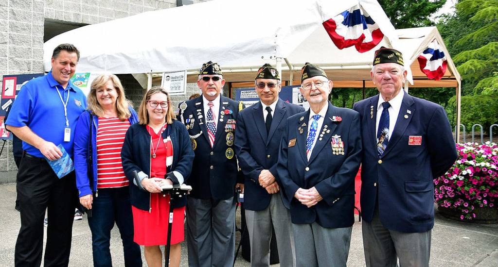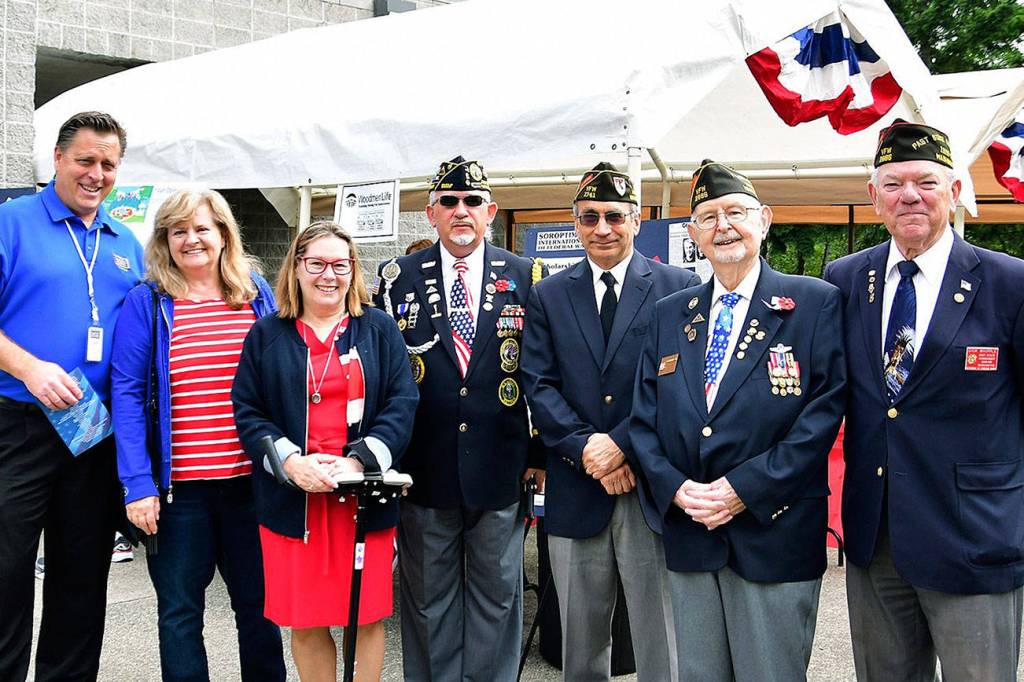 In attendance, from left, were: Don Leingang, U.S.Navy Officer, retired, executive director, USO Northwest, Soroptimist member; Susan Honda, deputy mayor, Federal Way, Soroptimist member; Chriss R. Moen, Disabled American Veterans (DAV) Chapter A-One, No. 33, Kent, and the American Legion Post 15; Mike Sepal, VFW Post 1741, Auburn; Tom Leonard, VFW Post 2886, Federal Way, and DAV Chapter A-One, No. 33; Dick Whipple, VFW Post 2886 and DAV Chapter A-One, No. 33.