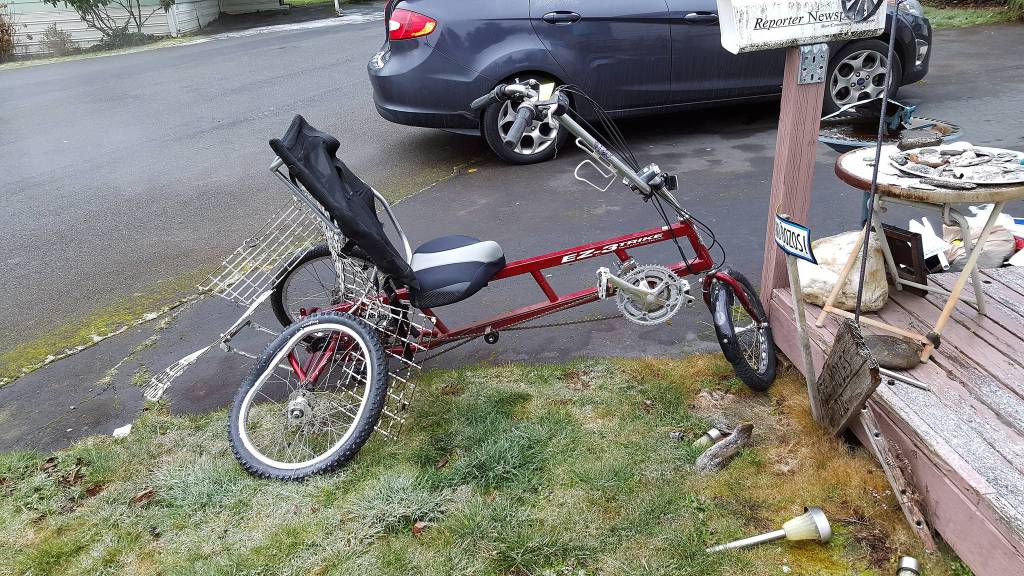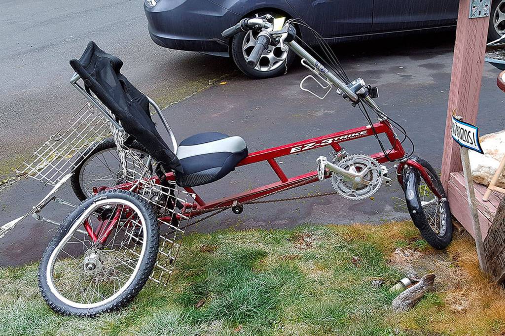 A hit-and-run incident on March 8 seriously injured Andrew Dinsmore and mangled his tri-bike. Kent Police arrived and found Dinsmore conscious. Riding his tri-bike around 5:30 a.m., Dinsmore was heading westbound on Southeast 256th Street at 135th Avenue Southeast when he was hit from behind in the bike lane on the north side of 256th between a fire hydrant and telephone pole near the Metro bus stop. COURTESY PHOTO