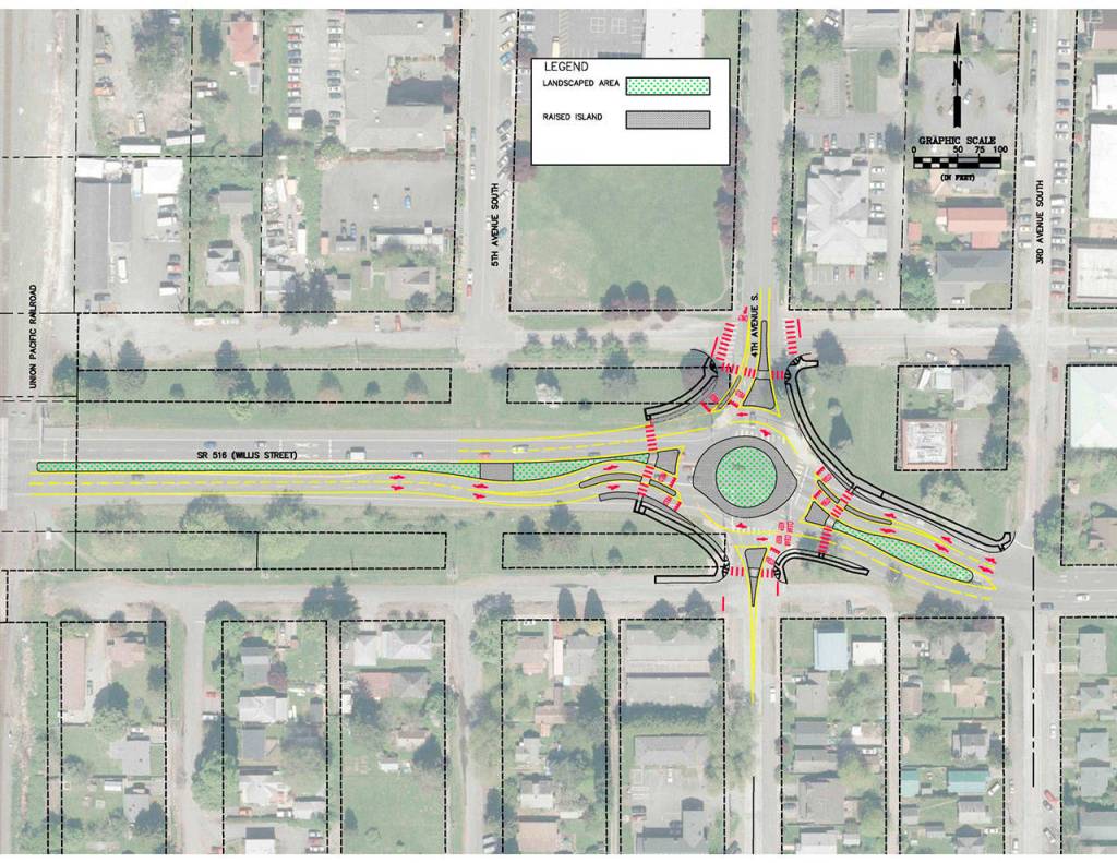 The existing signalized intersection will be replaced with a roundabout. The project will include new sidewalks, crosswalks, and landscaping. The roundabout is required to obtain state Department of Transportation approval (because it is a state highway) for new northbound roads connecting to SR 516 east of the Valley Freeway (SR 167).
