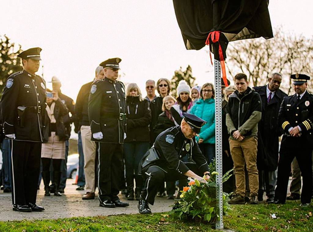 Kent Police officers, Mayor Dana Ralph, Kent City Council members, Washington State Patrol troopers and members of the Puget Sound Regional Fire Authority dedicated the sign on Tuesday. The sign is on the north side of Willis Street, just west of Fourth Avenue South, and faces westbound traffic.