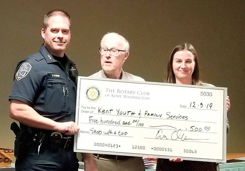 Below photo: The club also donated $500 to Kent Youth and Family Services for its annual Shop With A Cop event to provide children an opportunity to spend $100 or more at Kent’s East Hill Target to buy gifts with officers for the holidays. Pictured are Kent Police Officer Jared Kasner and Rotarians Ron Harmon and Lilly Stellmon (of KYFS).