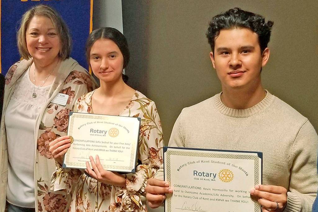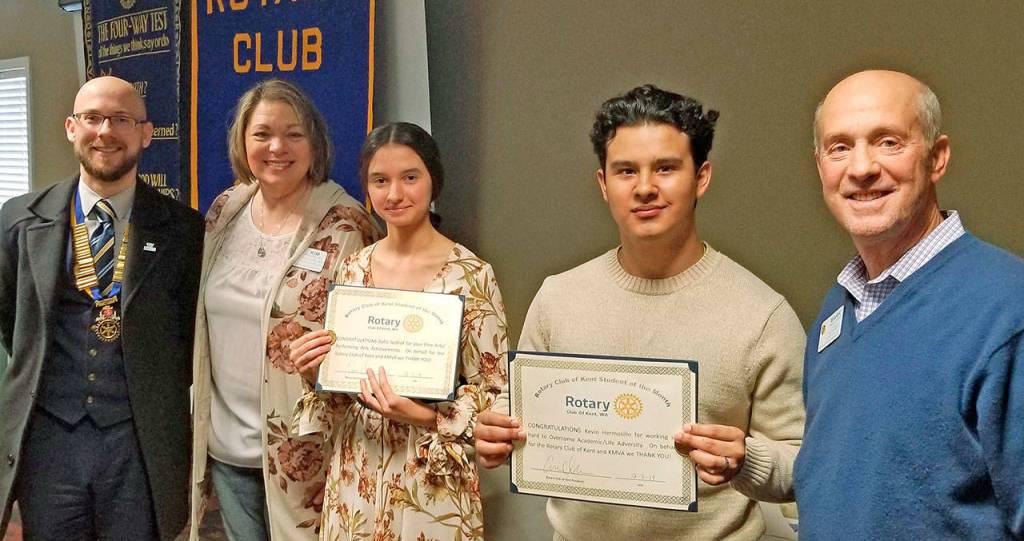 The Rotary Club of Kent recently recognized two students from Mountain View Academy as Students of the Month, above. Pictured are Club President Erik Olsen, Rotarian Kim Walley, students Sofia Sednef and Kevin Hermosillo, and Rotarian Mark Scarff.