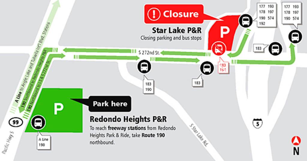 Sound Transit will permanently close the Star Lake Park-and-Ride lot on Saturday, March 21, in Kent and redirect commuters to the Redondo Heights Park-and-Ride in Federal Way to make way for the construction of a new Link light rail station and garage on the site.