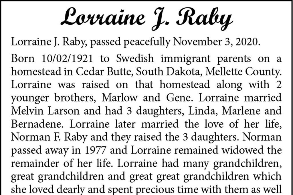 Lorraine J. Raby, passed peacefully November 3, 2020. Born 10/02/1921 to Swedish immigrant parents on a homestead in Cedar Butte, South Dakota, Mellette County.