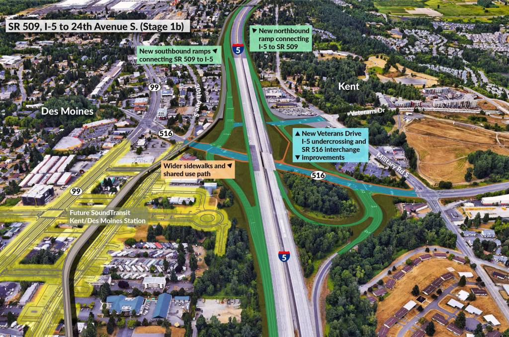 The project will include major changes in Kent to the State Route 516 interchange with I-5 and the extension of Veterans Drive from Military Road South underneath I-5.