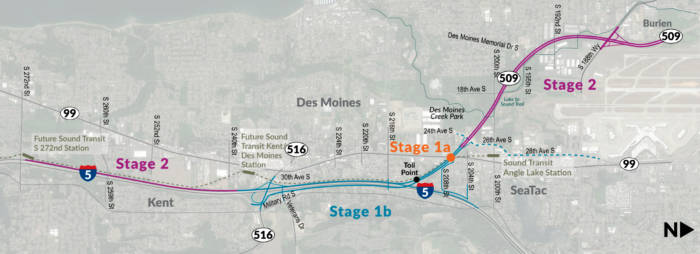 Sound Transit is working with WSDOT on the first stage since the Federal Way light rail extension, under construction and scheduled to be completed in 2024, covers a similar path through some communities. That work has started and includes a new SR 99 bridge near South 208th Street. Light rail will go over the bridge and SR 509 under it.