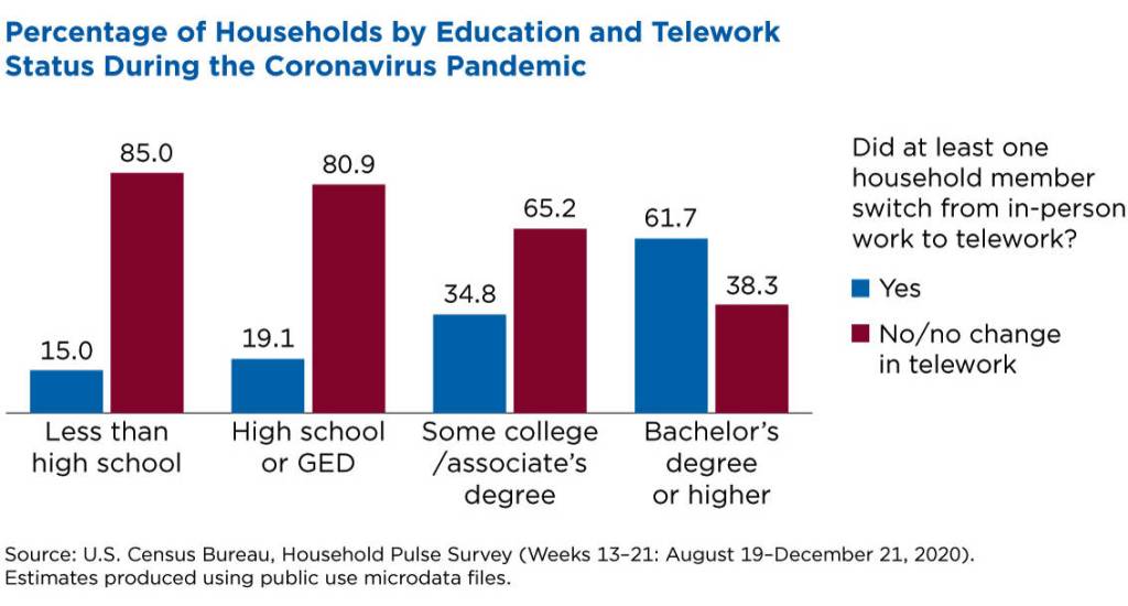 Educational attainment — closely linked to household income — is another key differentiating factor in the share of households with workers who switched to telework during the pandemic.