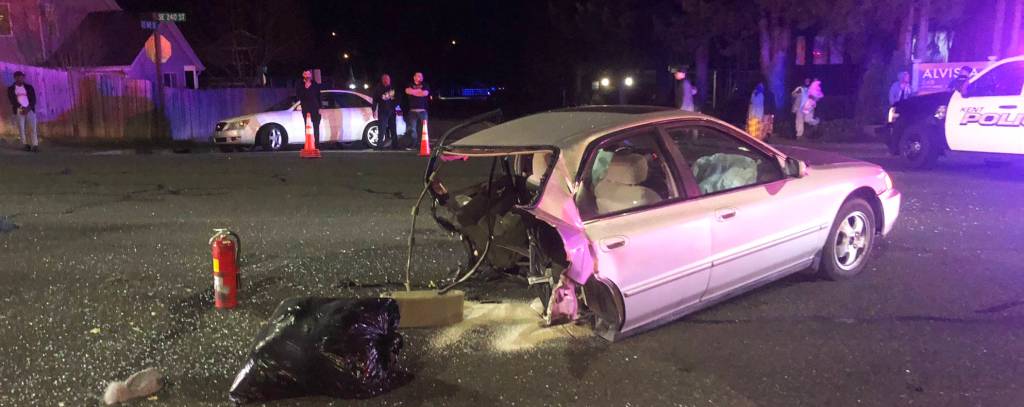 A suspect driving a stolen vehicle collided with another vehicle, causing that car to split apart, late Thursday night, April 1 at Southeast 240th Street and 112th Avenue Southeast on the East Hill in Kent.