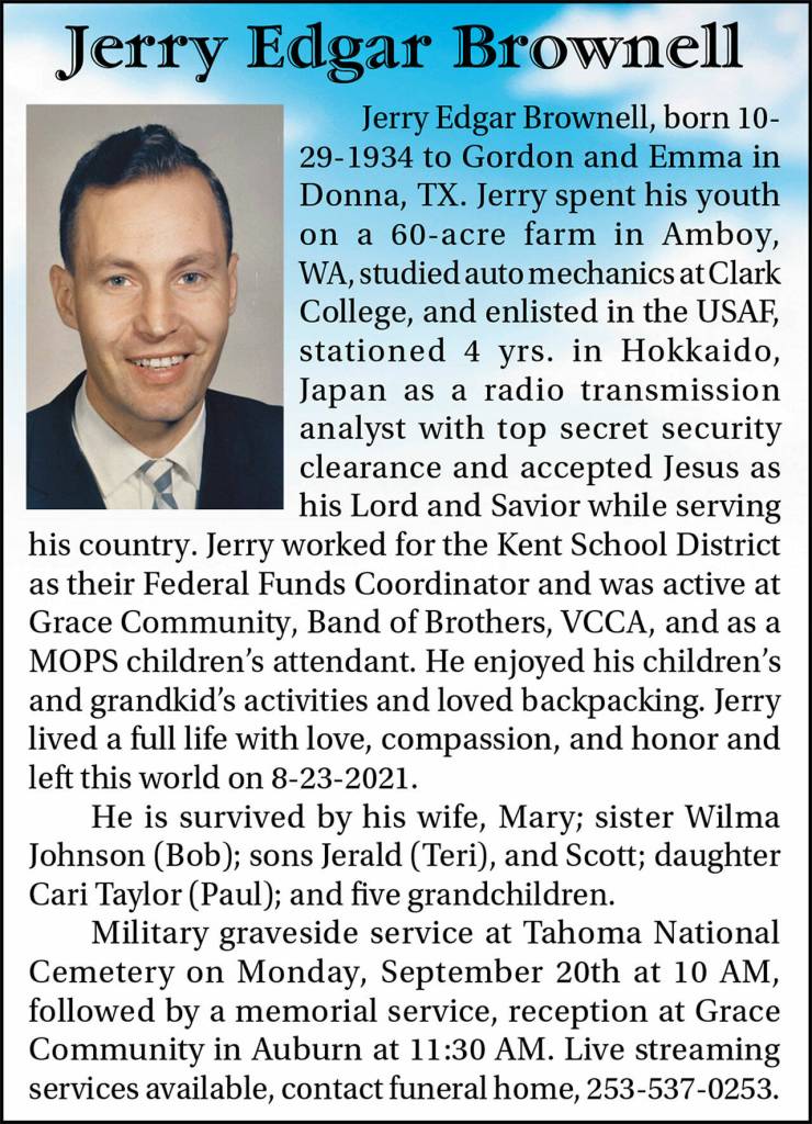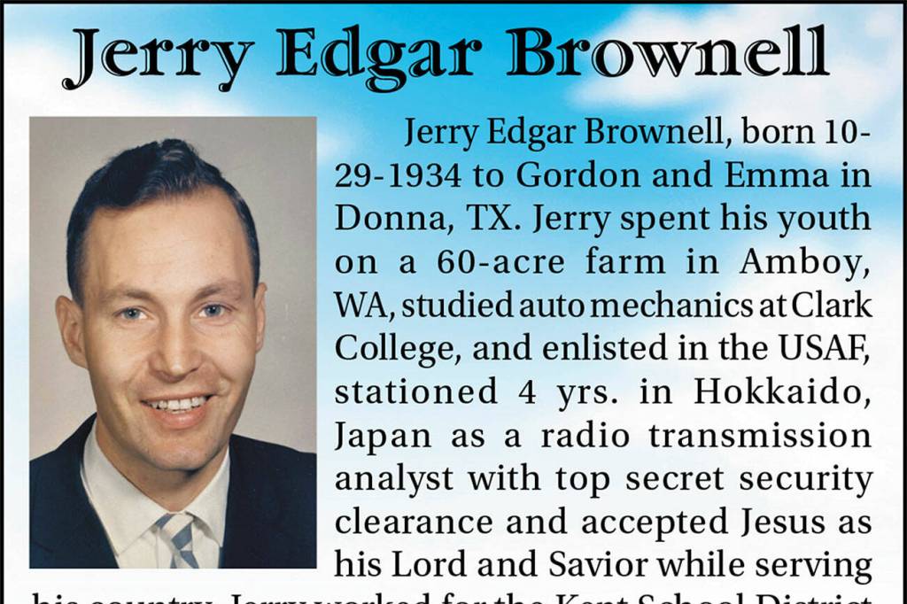 Jerry Edgar Brownell, born 10- 29-1934 to Gordon and Emma in Donna, TX. Jerry spent his youth on a 60-acre farm in Amboy, WA, studied auto mechanics at Clark College, and enlisted in the USAF, stationed 4 yrs. in Hokkaido, Japan as a radio transmission analyst with top secret security clearance and accepted Jesus as his Lord and Savior while serving his country. Jerry worked for the Kent School District as their Federal Funds Coordinator and was active at Grace Community, Band of Brothers, VCCA, and as a MOPS children’s attendant. He enjoyed his children’s and grandkid’s activities and loved backpacking. Jerry lived a full life with love, compassion, and honor and left this world on 8-23-2021.
