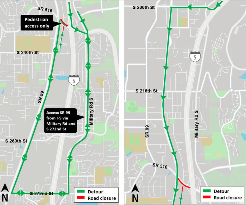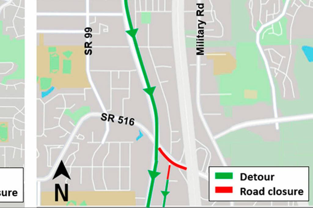 SR 516 will close from 10 p.m. to 5 a.m. on Dec. 16 and Dec. 20-23. Crews will try to reduce noise when possible, according to Sound Transit. Detours will be in place via South 272nd Street and South 200th Street.
