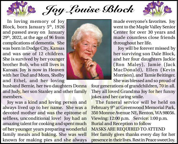 In loving memory of Joy Block, born January 5th, 1926, and passed away on January 29th, 2022, at the age of 96 from complications of dementia. She was born in Dodge City, Kansas and was one of 12 children.