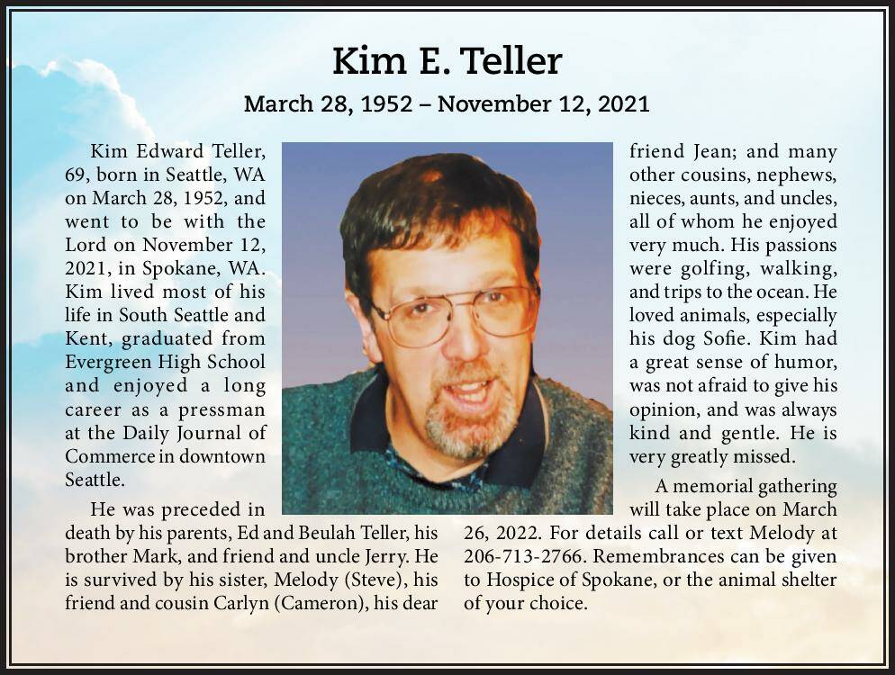 Kim Edward Teller, 69, born in Seattle, WA on March 28, 1952, and went to be with the Lord on November 12, 2021, in Spokane, WA. Kim lived most of his life in South Seattle and Kent, graduated from Evergreen High School and enjoyed a long career as a pressman at the Daily Journal of Commerce in downtown Seattle.