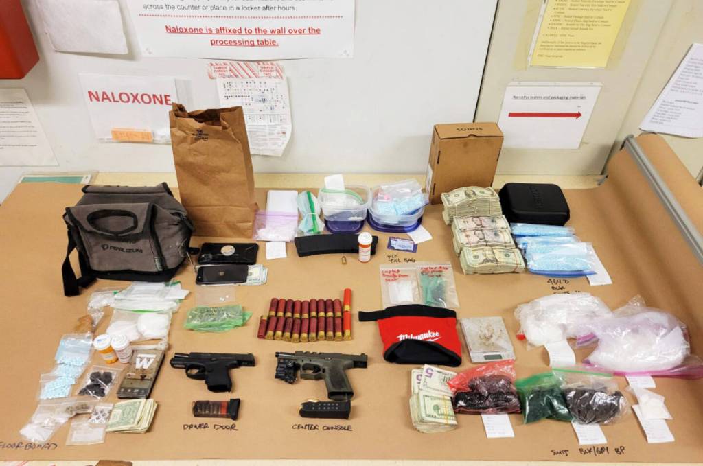 Inside, police said they found 890 grams of methamphetamine, 863 grams of heroin, 577 grams of fentanyl pills, 14 grams of cocaine, two handguns and more than $20,000 in cash.
