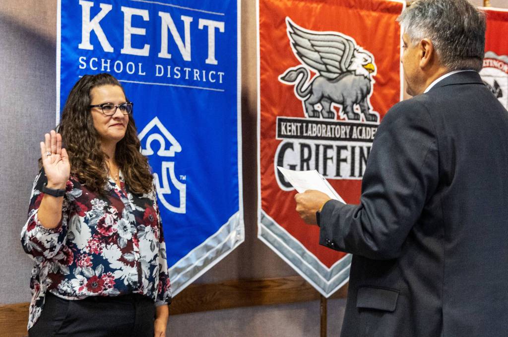 Kent School District Superintendent Israel Vela swore in Margel at the Sept. 14 board meeting. The board selected Margel at a special meeting Sept. 1 to fill the District 2 position left vacant after Michele Bettinger resigned in June.