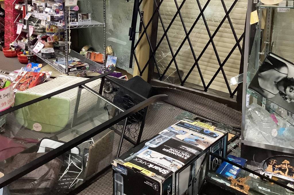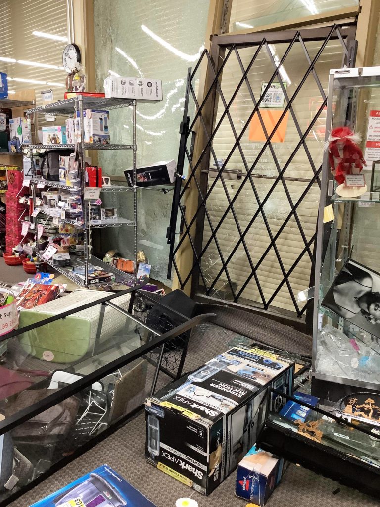 “The rolling shutter that was installed about a year and half ago was damaged and may need to be completely replaced,” he said. “There were two approximately 20 feet by 6 feet pieces of tempered, armored glass that were completely shattered. The glass door and folding gates behind them were also destroyed and the frame pushed in. A 6 feet by 6 feet tall glass showcase was smashed along with many glass and crystal pieces inside. The door of a smaller case was also broken, rendering it unusable.”