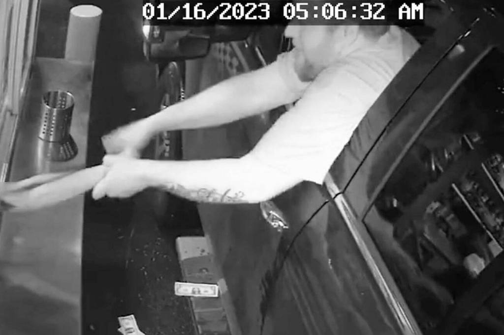 “The suspect lurches out and appears to attempt to place the looped ziptie around the head of the victim as if to lasso her,” the narrative continues. “It just misses her head as she reacts and starts to pull back. [He loses] his grip on her right hand, allowing [her] to fall back into the stand. Once back, she quickly closes the window and moves out toward the cash register.”