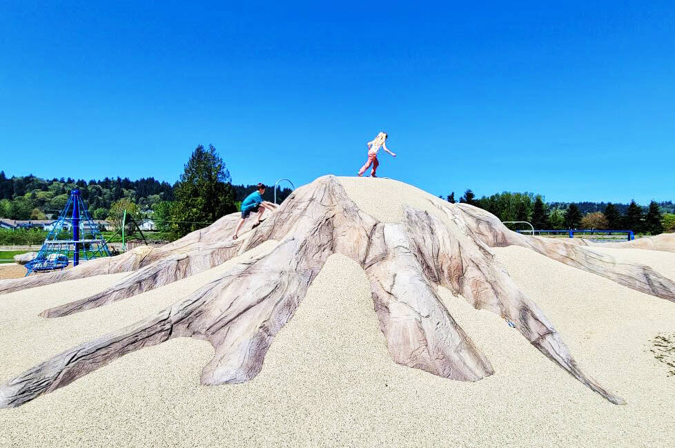 Now in a new but similar location, the city of Kent’s Van Doren’s Landing Park near the Green River showcases a custom Mount Rainier climbing structure for children among many other features.
