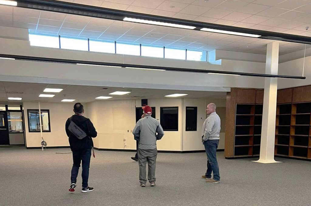 Kent School Board President Joe Bento, left, board member Tim Clark and district administrator Wade Barringer tour the new library at Canyon Ridge Middle School. COURTESY PHOTO, Leslie Hamada