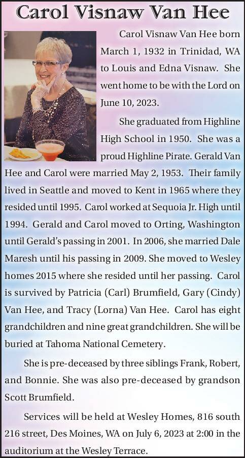 Carol Visnaw Van Hee born March 1, 1932 in Trinidad, WA to Louis and Edna Visnaw. She went home to be with the Lord on June 10, 2023.