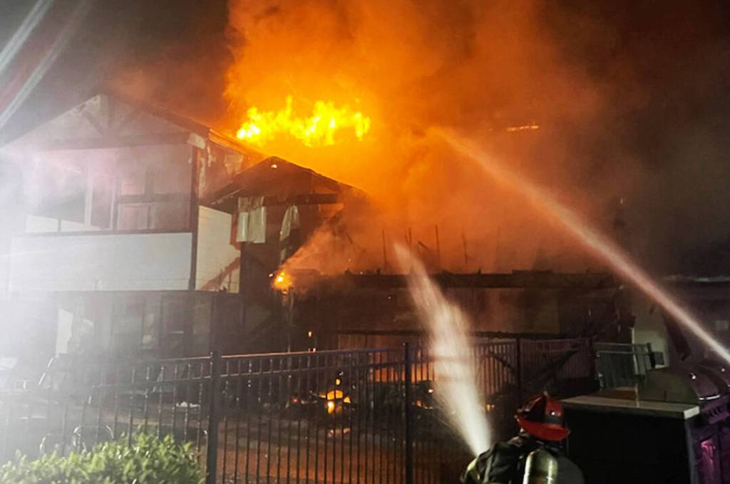 Firefighters battle a blaze Friday morning, May 17 in Kent at the Renew Water’s Edge Apartments leasing office in the 6200 block of South 238th Place. COURTESY PHOTO, Puget Sound Fire
