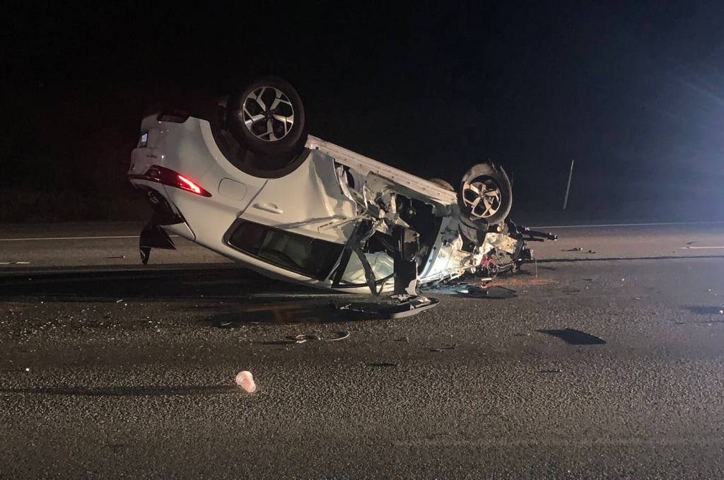 A bit north of the Toyota troopers saw a 2021 Kia Sportage that was on its top in lane three with the driver out of the vehicle and walking around.
