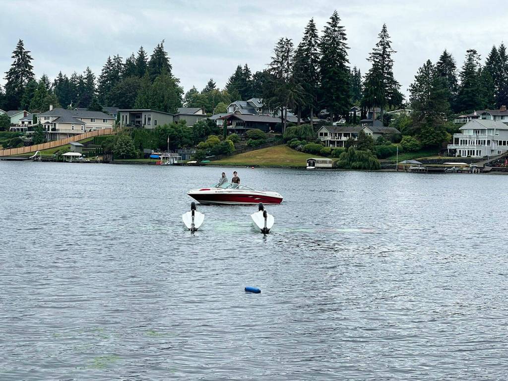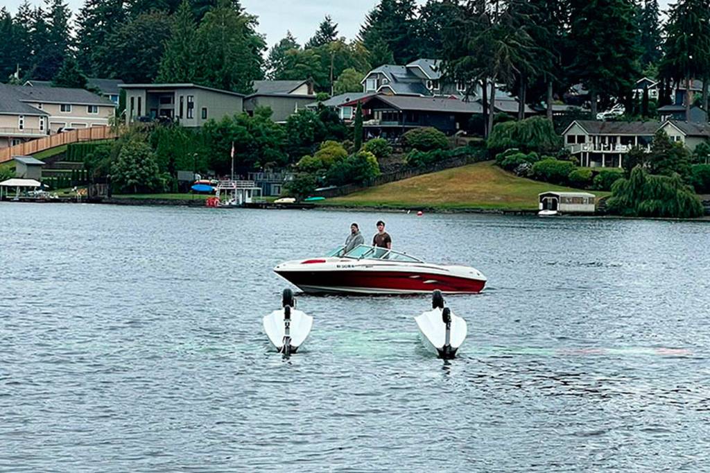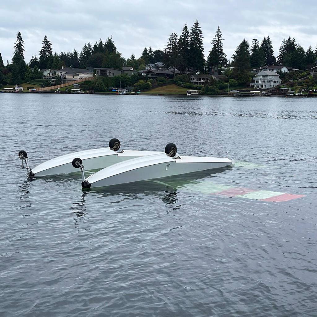 A boat near the upside down seaplane that crashed Saturday morning, Aug. 24 into Lake Meridian in Kent. COURTESY PHOTO, Puget Sound Fire