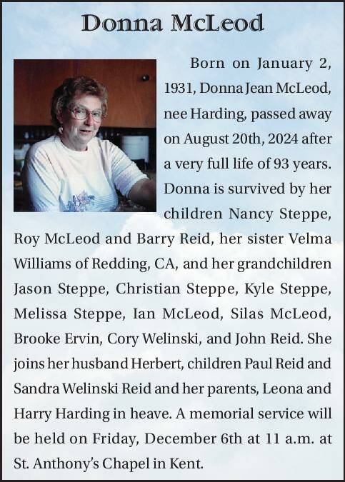 Born on January 2, 1931, Donna Jean McLeod, nee Harding, passed away on August 20th, 2024 after a very full life of 93 years. Donna is survived by her children Nancy Steppe, Roy McLeod and Barry Reid, her sister Velma Williams of Redding, CA, and her grandchildren Jason Steppe, Christian Steppe, Kyle Steppe, Melissa Steppe, Ian McLeod, Silas McLeod, Brooke Ervin, Cory Welinski, and John Reid. She joins her husband Herbert, children Paul Reid and Sandra Welinski Reid and her parents, Leona and Harry Harding in heave. A memorial service will be held on Friday, December 6th at 11 a.m. at St. Anthony’s Chapel in Kent.