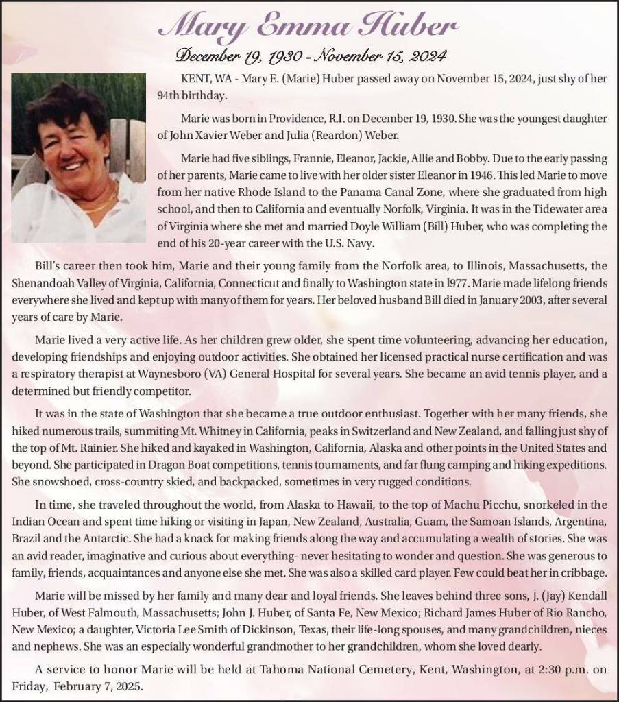 A service to honor Marie will be held at Tahoma National Cemetery, Kent, Washington, at 2:30 p.m. on Friday, February 7, 2025.