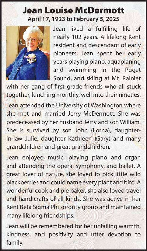Jean attended the University of Washington where she met and married Jerry McDermott. She was predeceased by her husband Jerry and son William. She is survived by son John (Lorna), daughter- in-law Julie, daughter Kathleen (Gary) and many grandchildren and great grandchildren.