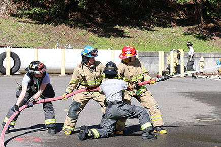 In addition, all those attending participated in hands-on training using ladders, ladder carries and ladder raises, forcible entry, hoisting a hose bundle up to the third floor, exiting the drill tower, flowing water from a charged hose line, connecting a supply line to a fire hydrant, starting a chainsaw, performing 10 swings of a sledgehammer, completing an equipment carry and a dummy drag. They also had the opportunity to complete the search and rescue confidence course.