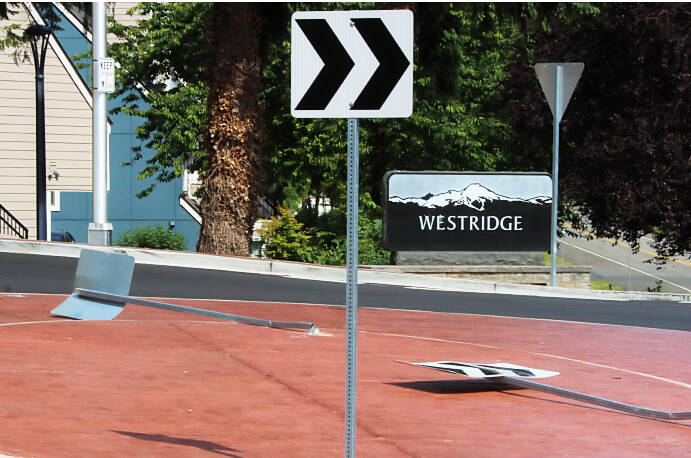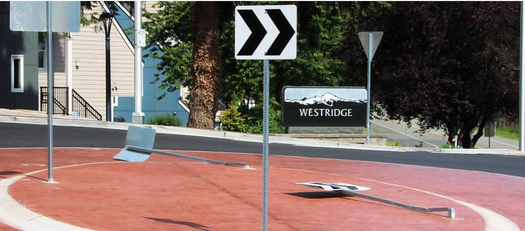 The roundabouts opened to traffic earlier in the year. Dengler filed two reports about downed signs in May and thanked crews for the fix before the ribbon cutting, only to see two more signs go down after the ceremony.