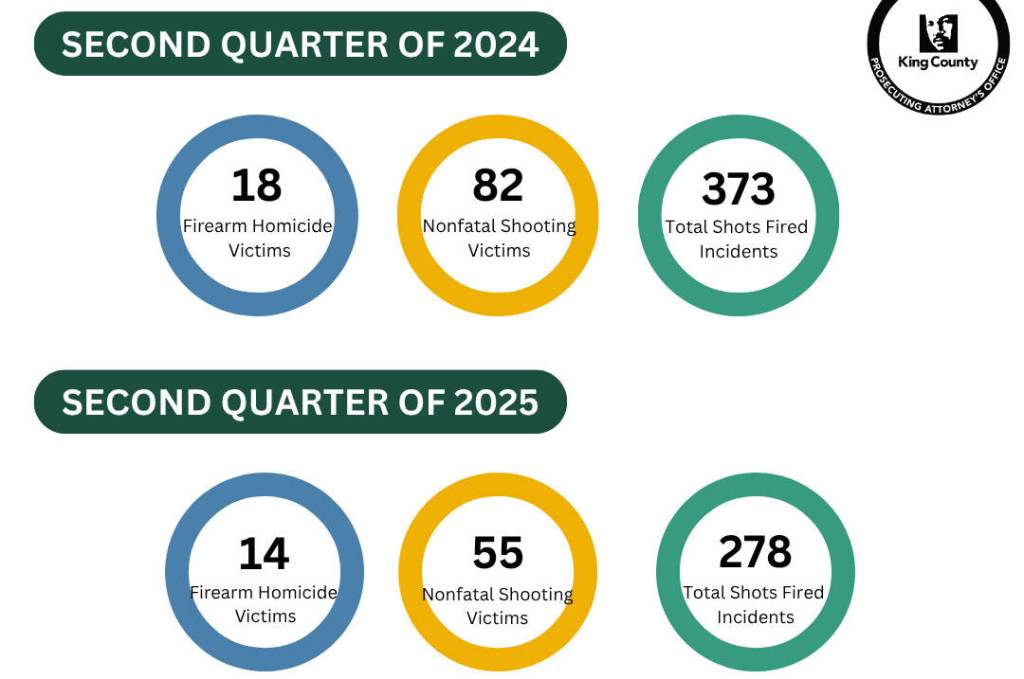 New data released Thursday, July 24 by King County Prosecuting Attorney Leesa Manion shows King County is experiencing a decrease in gun violence that began in 2024, continued in the first quarter of 2025, and now is confirmed to have continued into the second quarter of this year, according to a King County Prosecuting Attorney’s Office press release.