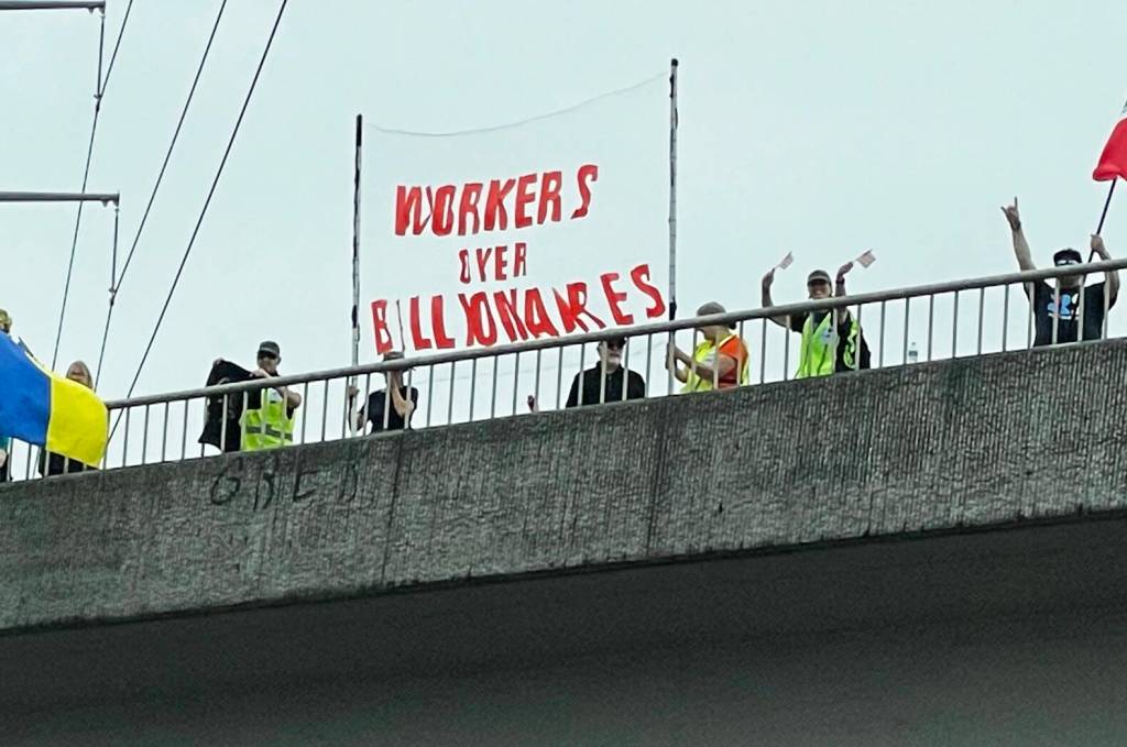 People displayed banners atop overpasses on State Route 18 along Covington-Sawyer Road and on State Route 167 along Southeast 277th Street on the Kent/Auburn border