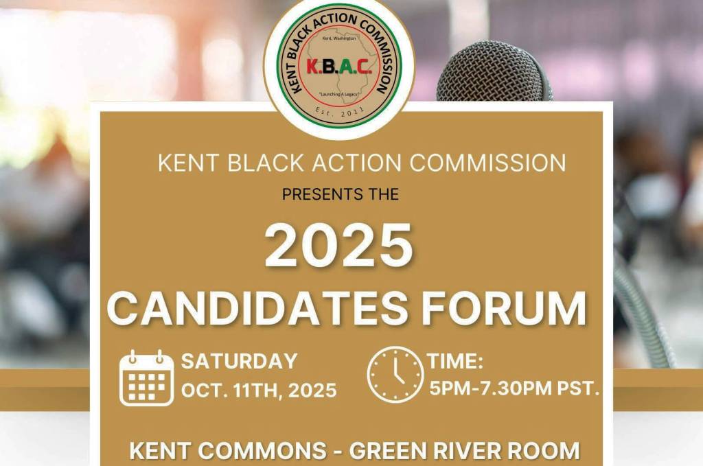 Candidates for the Kent City Council, King County Council and state Legislature are scheduled to be part of the Kent Black Action Commission 2025 Candidates Forum from 5 to 7:30 p.m. Saturday, Oct. 11 at the Kent Commons Green River Room, 525 Fourth Ave. N.