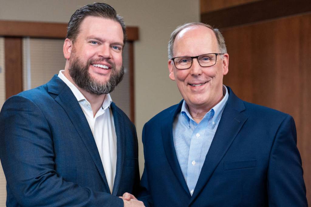 Geoff Bullock, president & CEO of Harborstone Credit Union, and Dan LeFree, president & CEO of Community 1st Credit Union. COURTESY PHOTO, Harborstone Credit Union