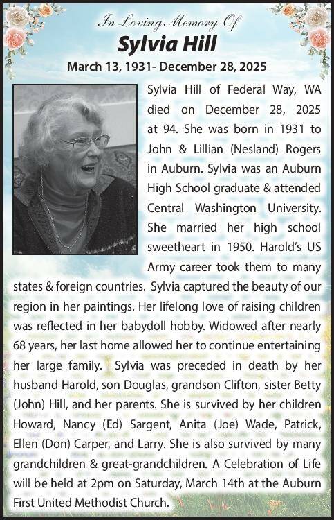 Sylvia Hill of Federal Way, WA died on December 28, 2025 at 94. She was born in 1931 to John & Lillian (Nesland) Rogers in Auburn. Sylvia was an Auburn High School graduate & attended Central Washington University. She married her high school sweetheart in 1950. Harold’s US Army career took them to many states & foreign countries. Sylvia captured the beauty of our region in her paintings. Her lifelong love of raising children was reflected in her babydoll hobby. Widowed after nearly 68 years, her last home allowed her to continue entertaining her large family. Sylvia was preceded in death by her husband Harold, son Douglas, grandson Clifton, sister Betty (John) Hill, and her parents. She is survived by her children Howard, Nancy (Ed) Sargent, Anita (Joe) Wade, Patrick, Ellen (Don) Carper, and Larry. She is also survived by many grandchildren & great-grandchildren. A Celebration of Life will be held at 2pm on Saturday, March 14th at the Auburn First United Methodist Church.