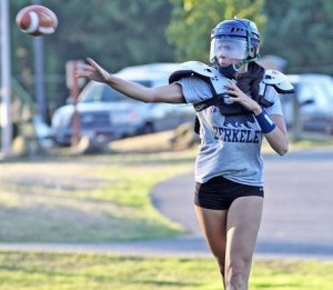 Seattle Mist quarterback Angela Rypien participates in a drill at a recent practice for the Kent-based team of the Lingerie Football League.