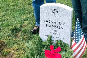 U.S. Army veterans Chriss Moen and Debi Lovelace, a Navy mother, salute after laying a wreath for departed…