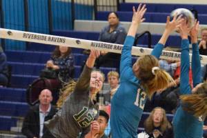 Kentridge High’s Kate Wick spikes the ball over the reach of Auburn Riverside’s Lanae Wohlmacher (12) and Camden…
