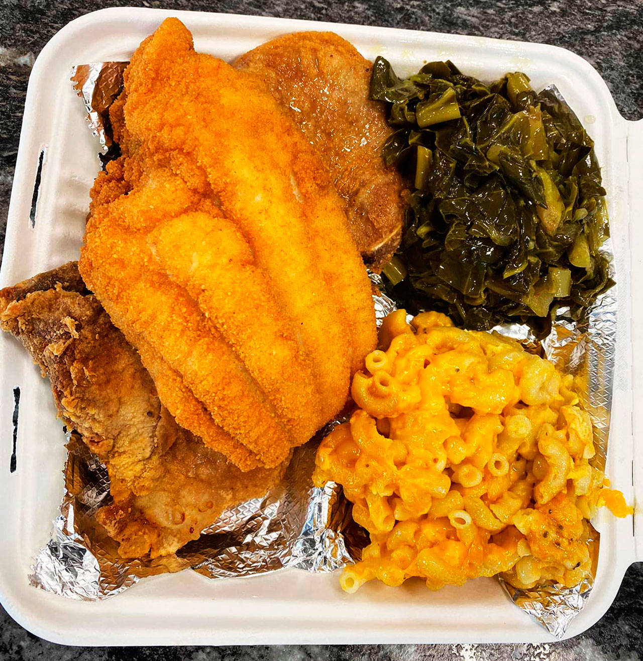 • “Yummy. Huge chicken wing tender and juicy while still crunchy. Perfectly done. Excellent Mac n cheese and collards. Again tender and flavorful.”