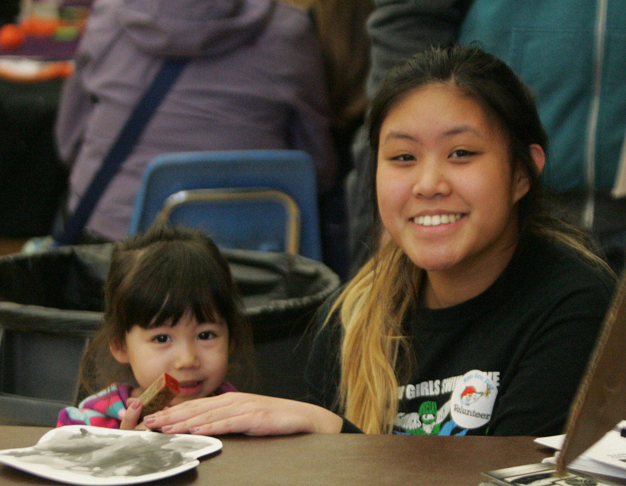 Abbey Quintos, Kentwood High senior Abbey Quintos stamps 2-year-old Molly Braaten’s project. DENNIS BOX, Reporter
