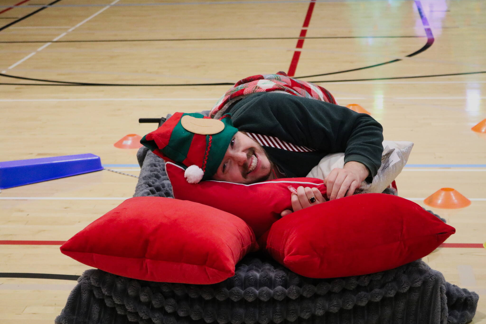 Different stations included a craft station, a giant snowball roll, pin-the-nose-on-the-reindeer, bow pickup, freeze dance, snowball free-throw, and the most difficult station, which tested the elf cadets’ stealthiness: Don’t Wake the Elf. With a sleepy head elf tucked into bed, the cadets have bells attached to their waists, and they must go through a small obstacle course without making a sound.