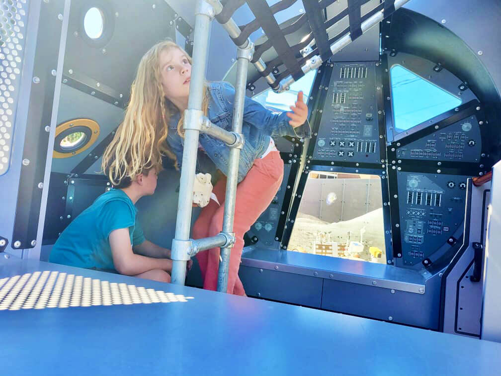 “Complementing these two elements and creating a campus of space-themed play is a Lunar Lander play structure and mission control panel with interactive games, working switches and buttons and an intercom that allows kids to talk back and forth as they imagine their own space exploration mission,” Parascondola said.