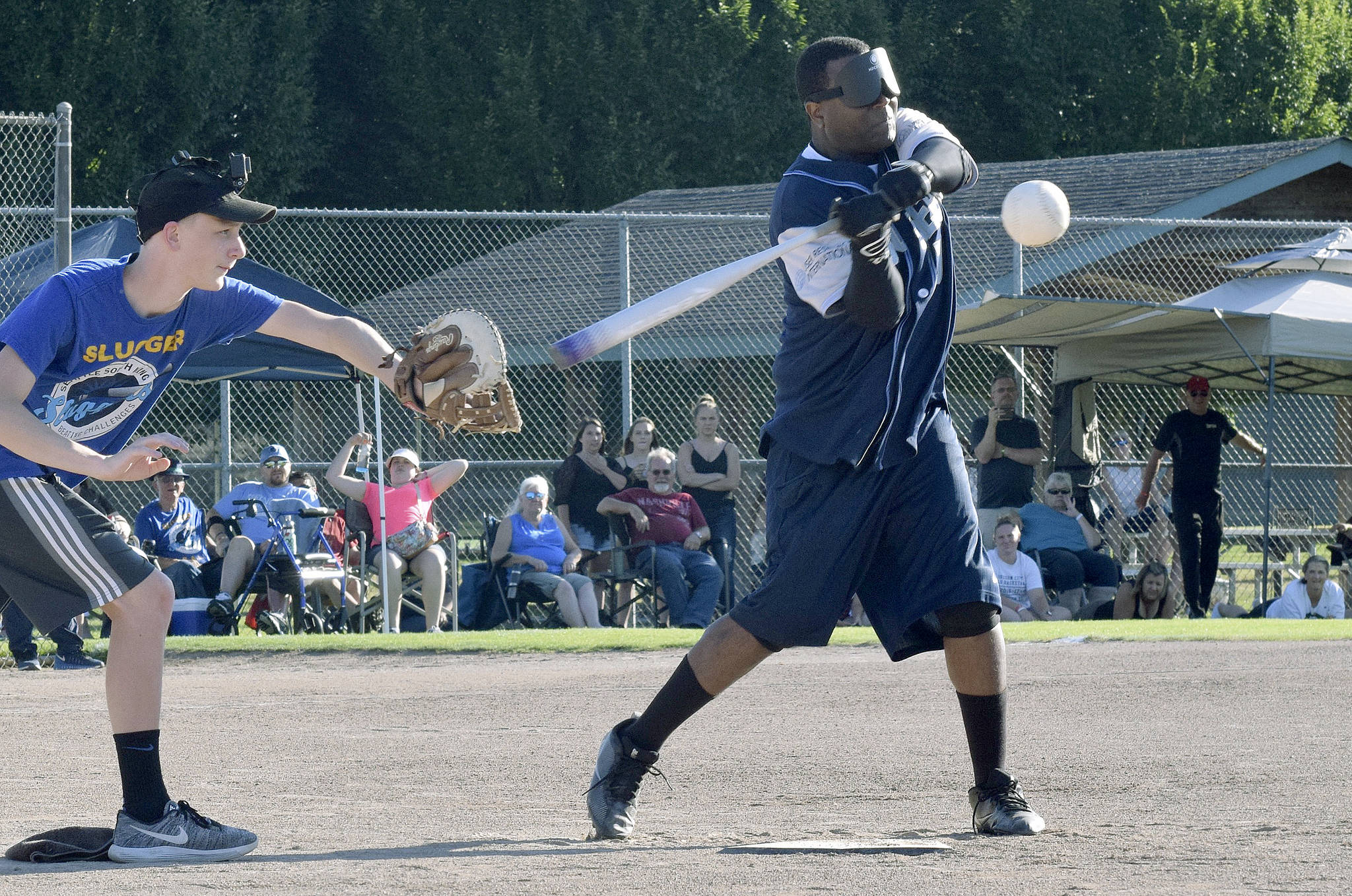 The Seattle South King Sluggers, a team of blind and visually-impaired athletes, squared off against blindfolded city of Kent employees in a beep baseball game at Hogan Park at Russell Road last Sunday.