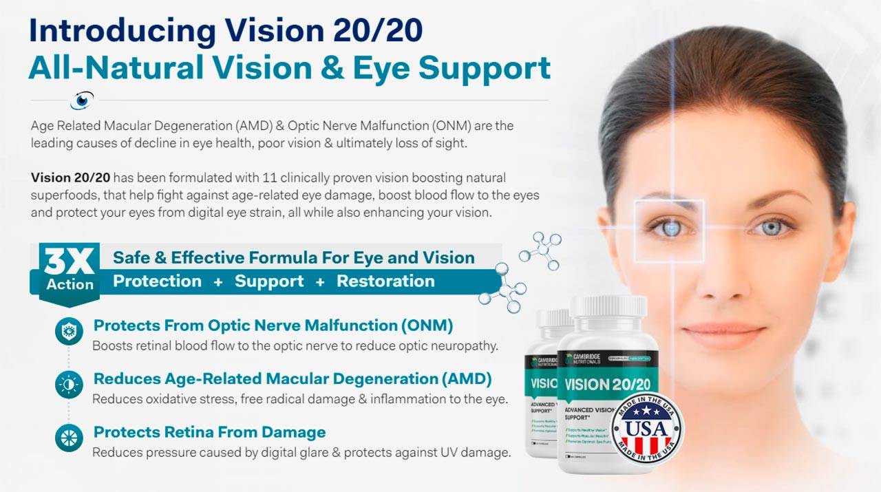 Vision 20/20 by Cambridge Nutritionals LLC, is a supplement that contains natural superfoods and according to the official website is made to support optic nourishment to the eyes, improve nerve health, and protect the retina. The formula which is backed by clinical studies helps to fight vision loss as it contains eleven herbs and natural ingredients. It also contains antioxidant properties that prevent disease, enhance blood circulation, and prevent urinary tract infections.