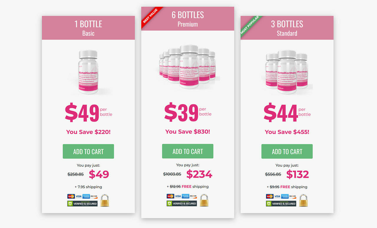 - 3 bottles, or the standard package of MenoHarmony will cost $132, here each bottle costs $44.
